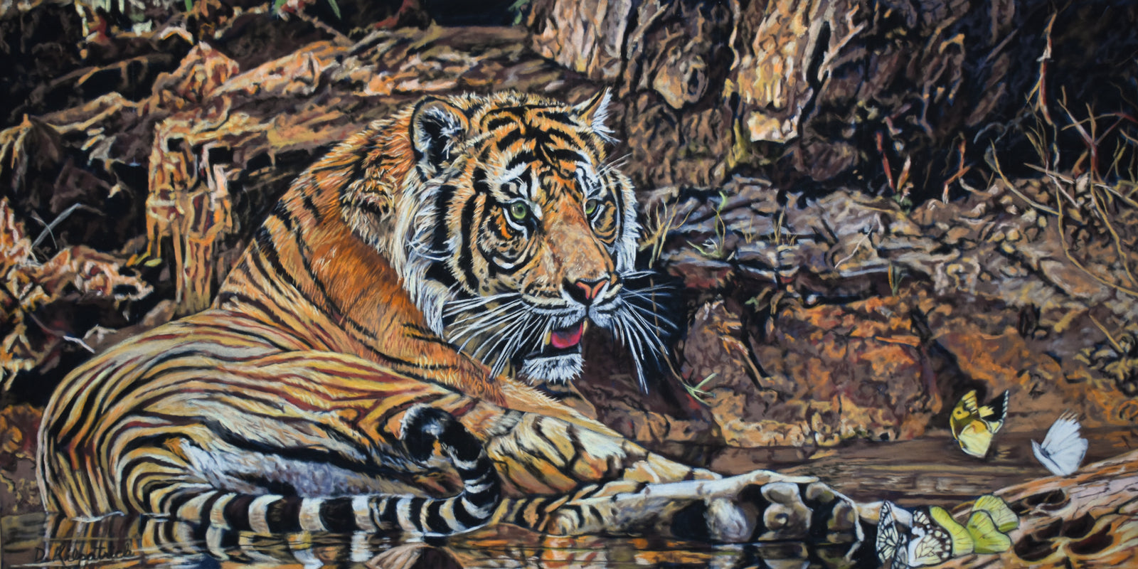 Bengal tiger laying down in water trying to escape the summer heat.